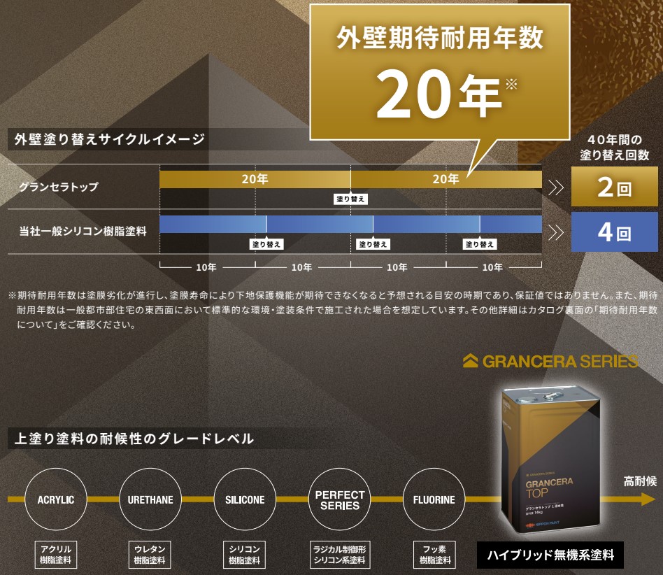 塗料外壁期待耐用年数が高ければ次に塗り変える時期が遅くなり、結果的に費用が抑えられる事があります。詳しくはお見積りの際にご確認下さい。
